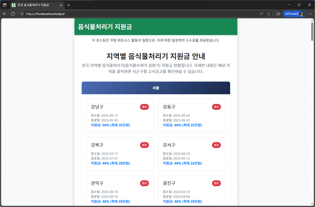 아래 사이트를 이용하면 전국 가정용 음식물 처리기 지원 현황을 한 눈에 확인할 수 있습니다.